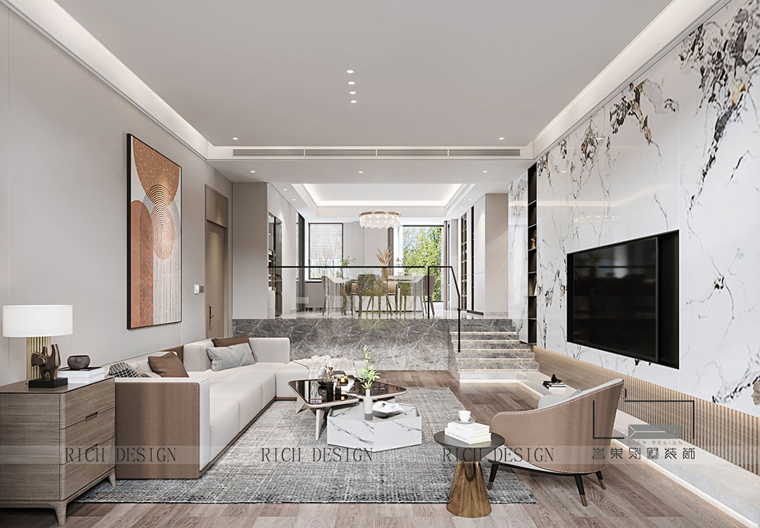 開放式布局是形式和精神的交匯融合,通過(guò)大理石和暖棕的色彩構(gòu)成來(lái)渲染氛圍,描摹了高級(jí)階層向往的休閑生活場(chǎng)景。