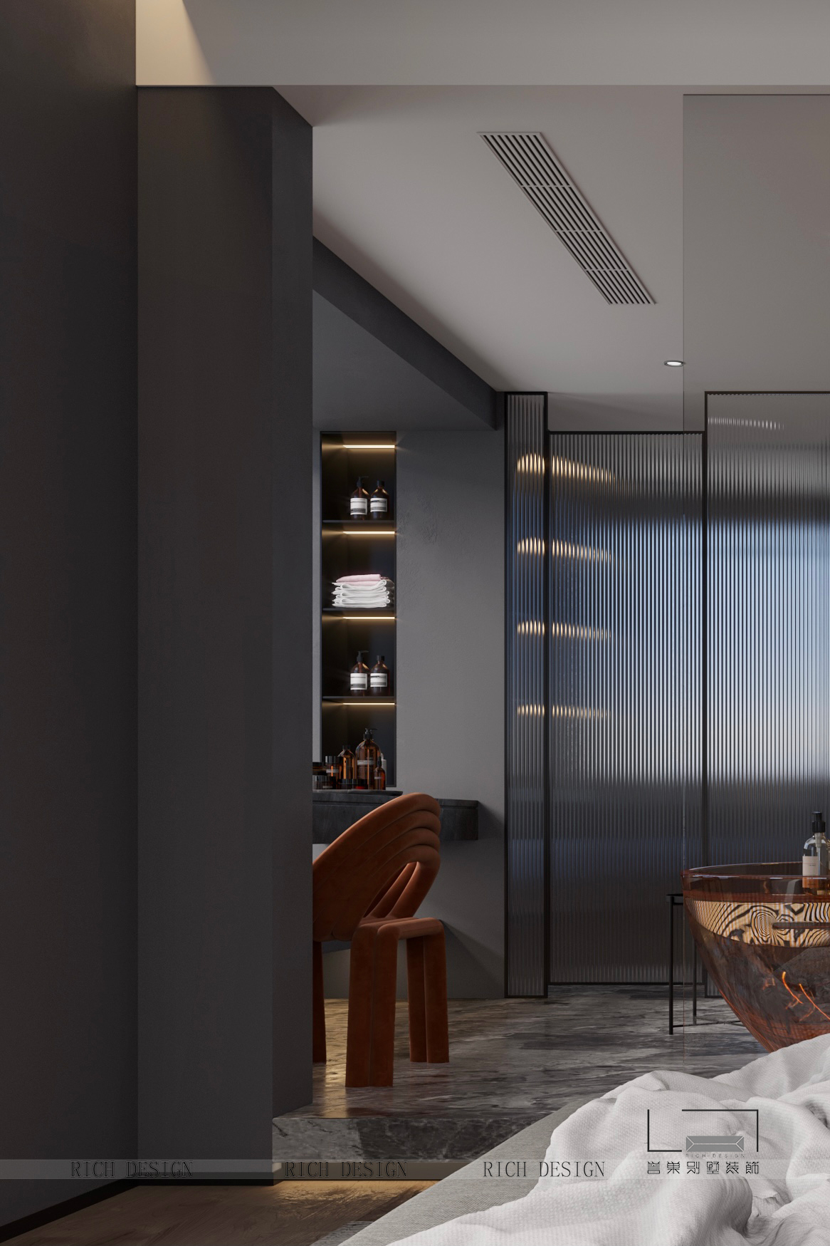 灰色與灰色,白色與白色,平平的色彩搭配,細膩的肌理處理,化妝區(qū)與洗浴區(qū)明暗與肌理平衡交融,場所的精神由此產(chǎn)生。