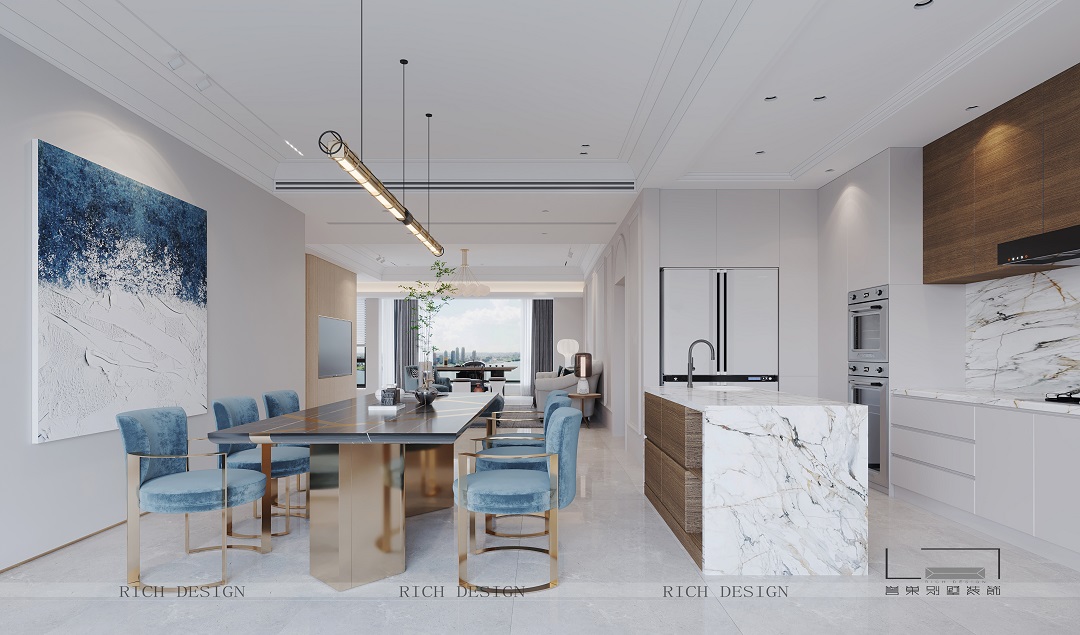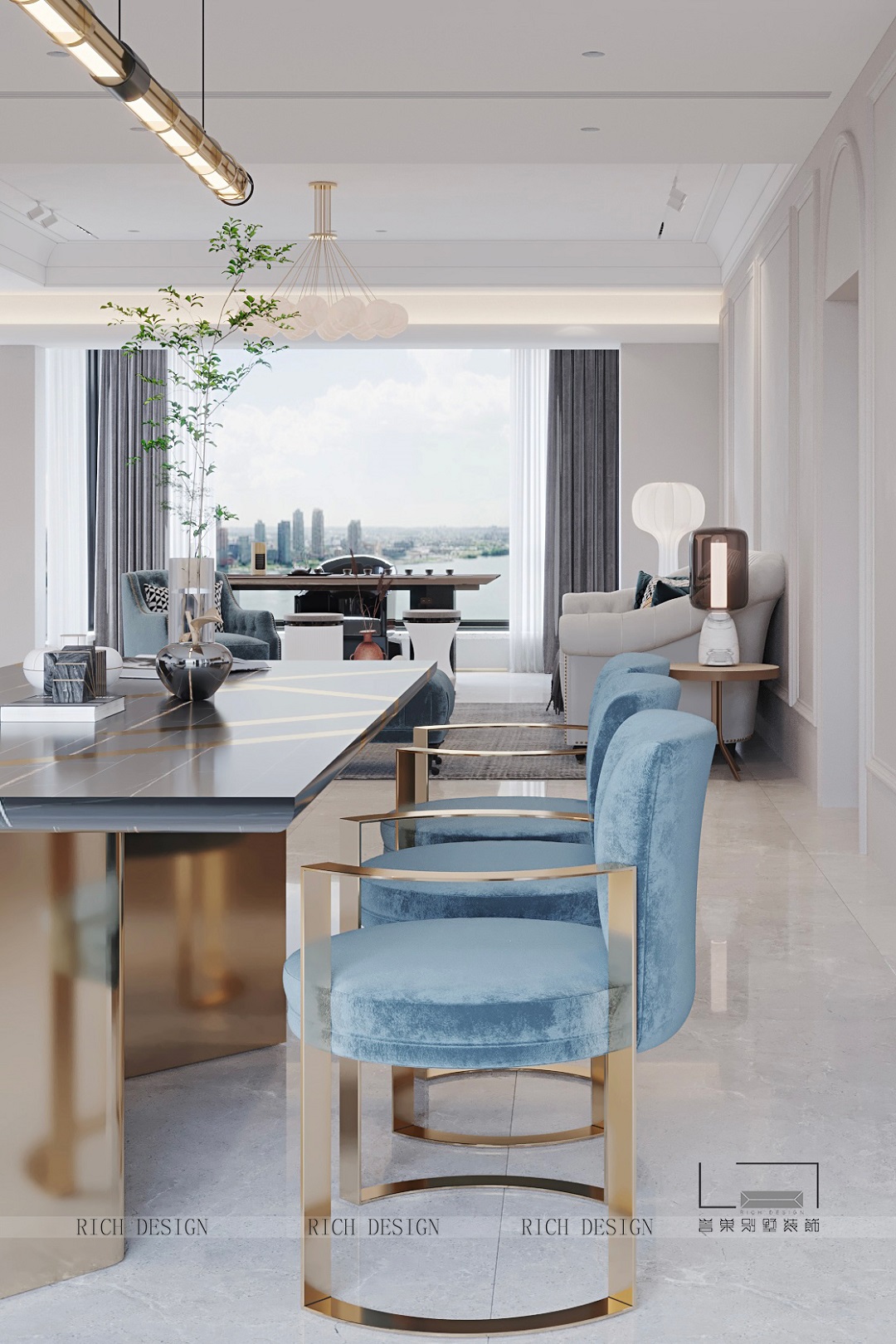 從客廳進(jìn)入到餐廳,簡(jiǎn)歐墻線與黃銅輕奢外表交匯出典雅大氣的魅力,大理石幾何拼接地板與墻上意象元素采用藝術(shù)的形式融入到生活設(shè)計(jì)。