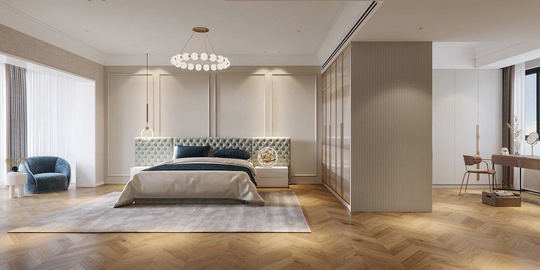主臥套房?jī)?nèi)設(shè)起居室、衣帽間和主衛(wèi),各功能區(qū)呈遞進(jìn)式布局。