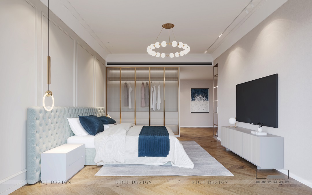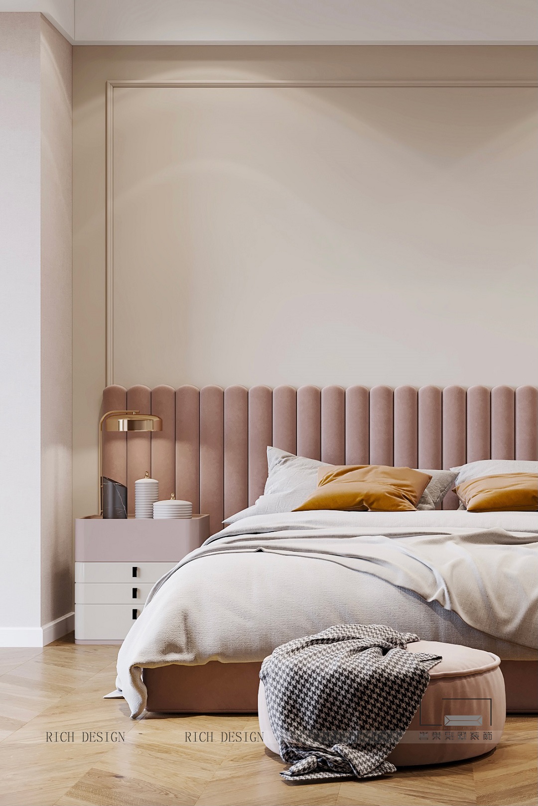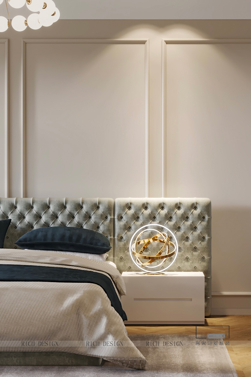 在立面上,將線性元素以空間圍合的方式貫穿其中,簡(jiǎn)致,流暢,搭配簡(jiǎn)歐輕奢家具,干凈素雅。結(jié)合大理石和金屬的紋理走向,讓空間背景兼具美觀舒適的同時(shí),植入安靜純粹的精神觀感。
