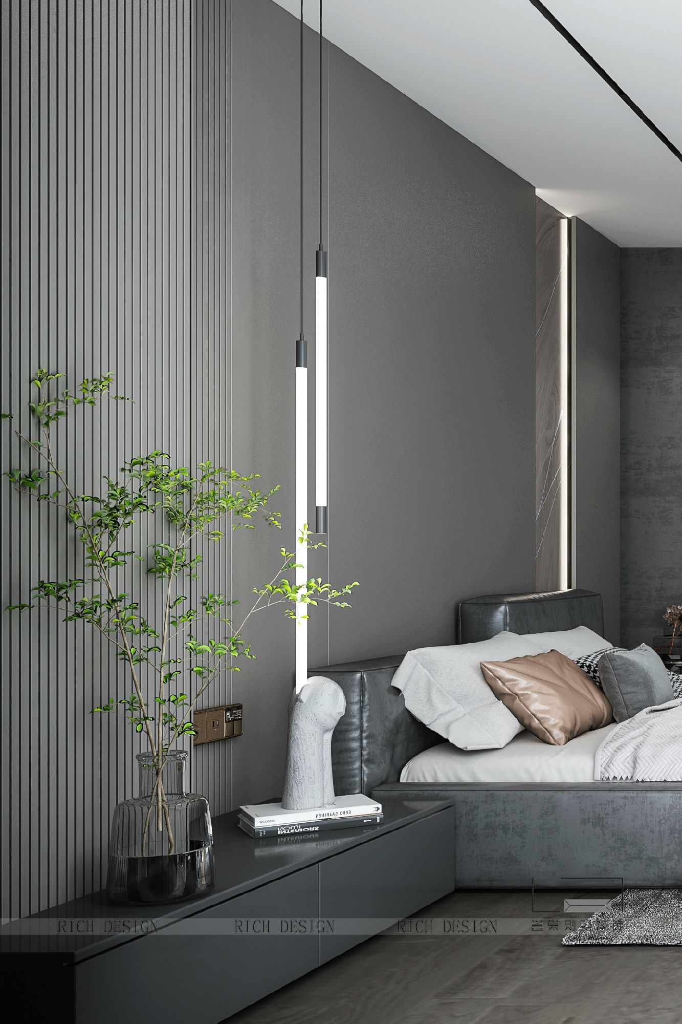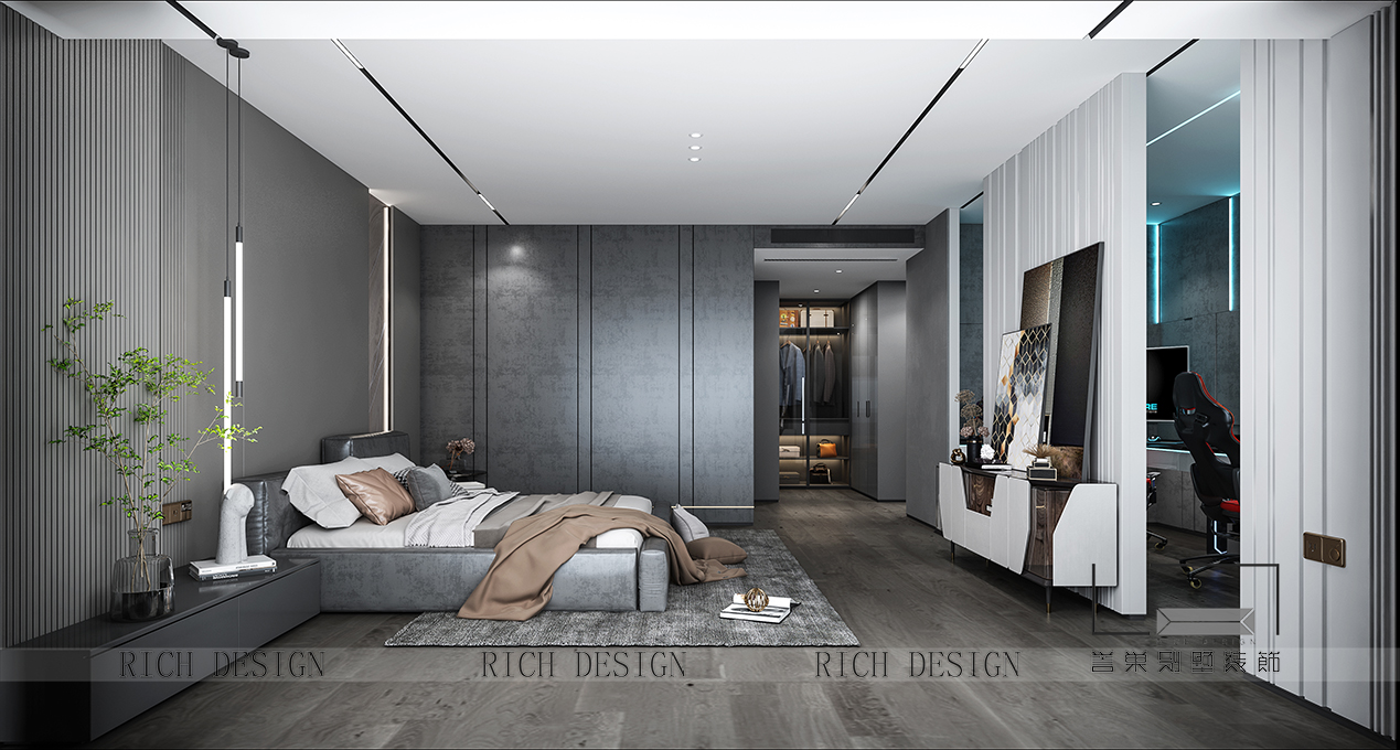 男孩房的空間則用深灰色營造出沉靜理性的臥房觀感,深灰與白為這種冷靜增添奢華質(zhì)感,串聯(lián)出室內(nèi)的情感主線。