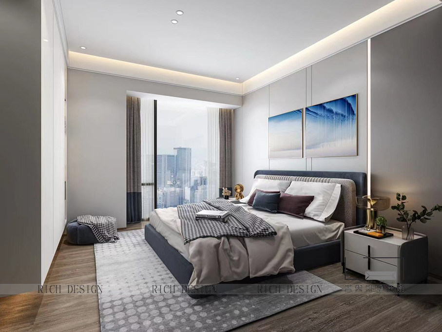 主臥延續(xù)低調(diào)簡雅的格調(diào),通過層疊的空間造型盡顯主人的尊貴身份,淺灰色床品搭配皮革墻面,陽光在彼此間形成隱隱的虛實對比,讓人更為放松愜意。